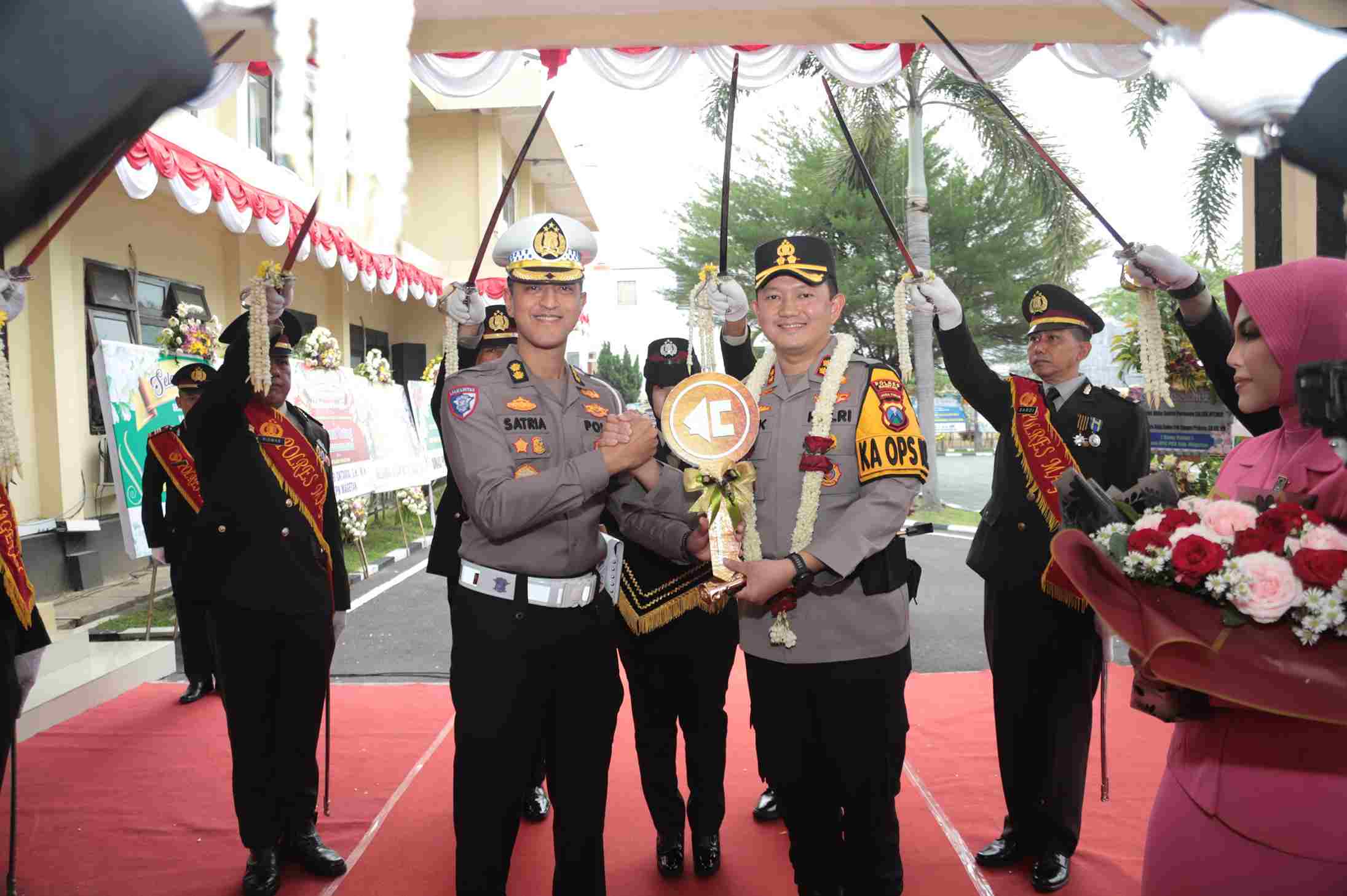 Di lobi Mapolres, pejabat lama AKBP Satria Permana menyambut dengan hangat dan secara simbolis menyerahkan kunci Mapolres kepada Kapolres baru sebagai tanda resmi peralihan kepemimpinan.