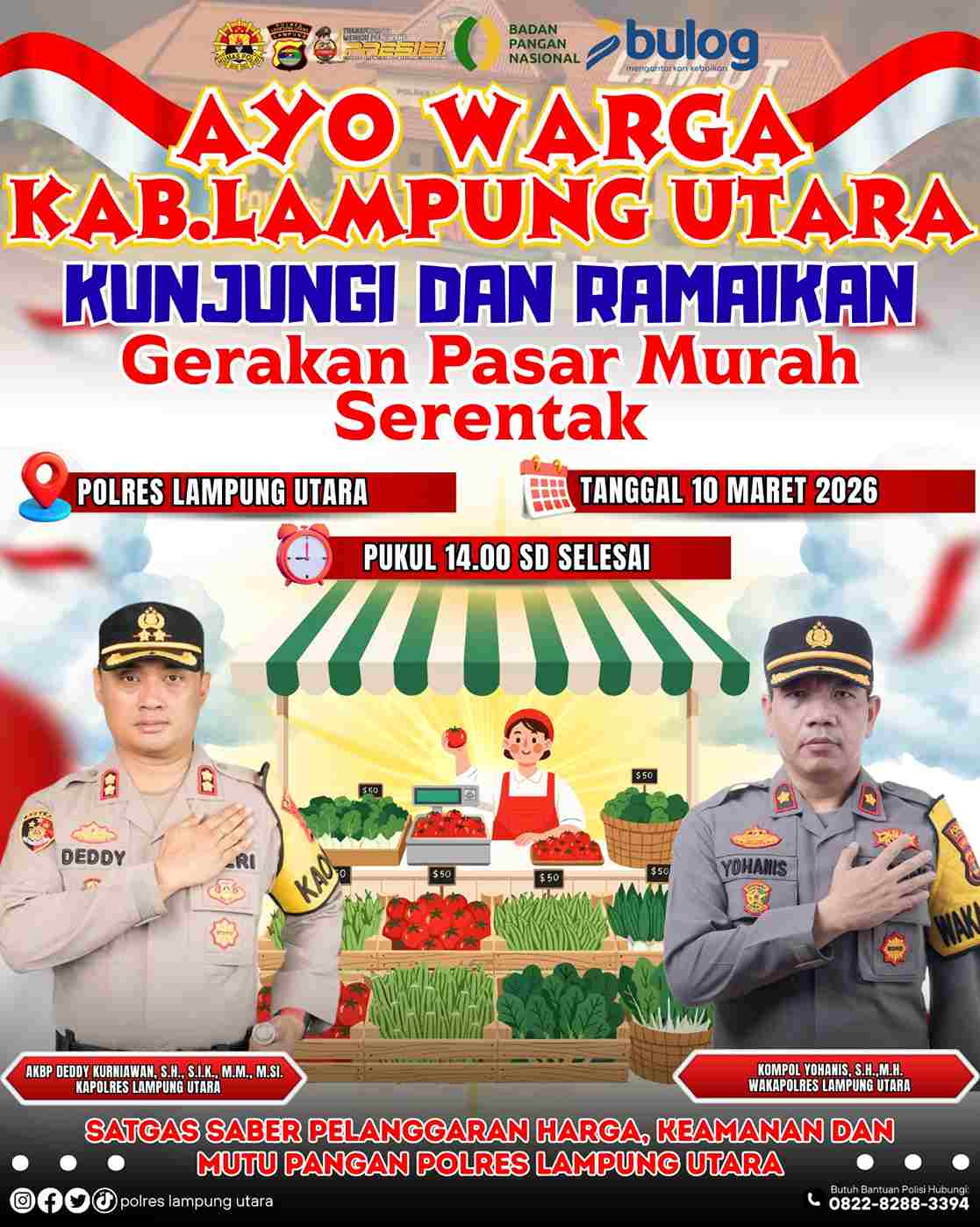 Dalam upaya membantu masyarakat memenuhi kebutuhan pokok dengan harga terjangkau, Polres Lampung Utara akan menggelar Gerakan Pasar Murah Serentak pada Selasa, 10 Maret 2026.
