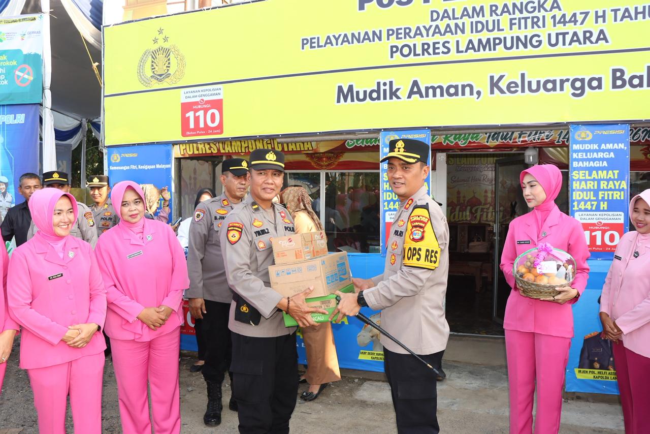 Dalam rangka mendukung kelancaran Operasi Ketupat Krakatau 2026, Kapolres Lampung Utara, AKBP Deddy Kurniawan, S.H., S.I.K., M.M., M.Si., bersama Ketua Bhayangkari Cabang Lampung Utara, Pejabat Utama (PJU), serta anggota Bhayangkari, melakukan kunjungan ke sejumlah Pos Pengamanan (Pos Pam) dan Pos Pelayanan (Pos Yan), Selasa (17/3/2026).