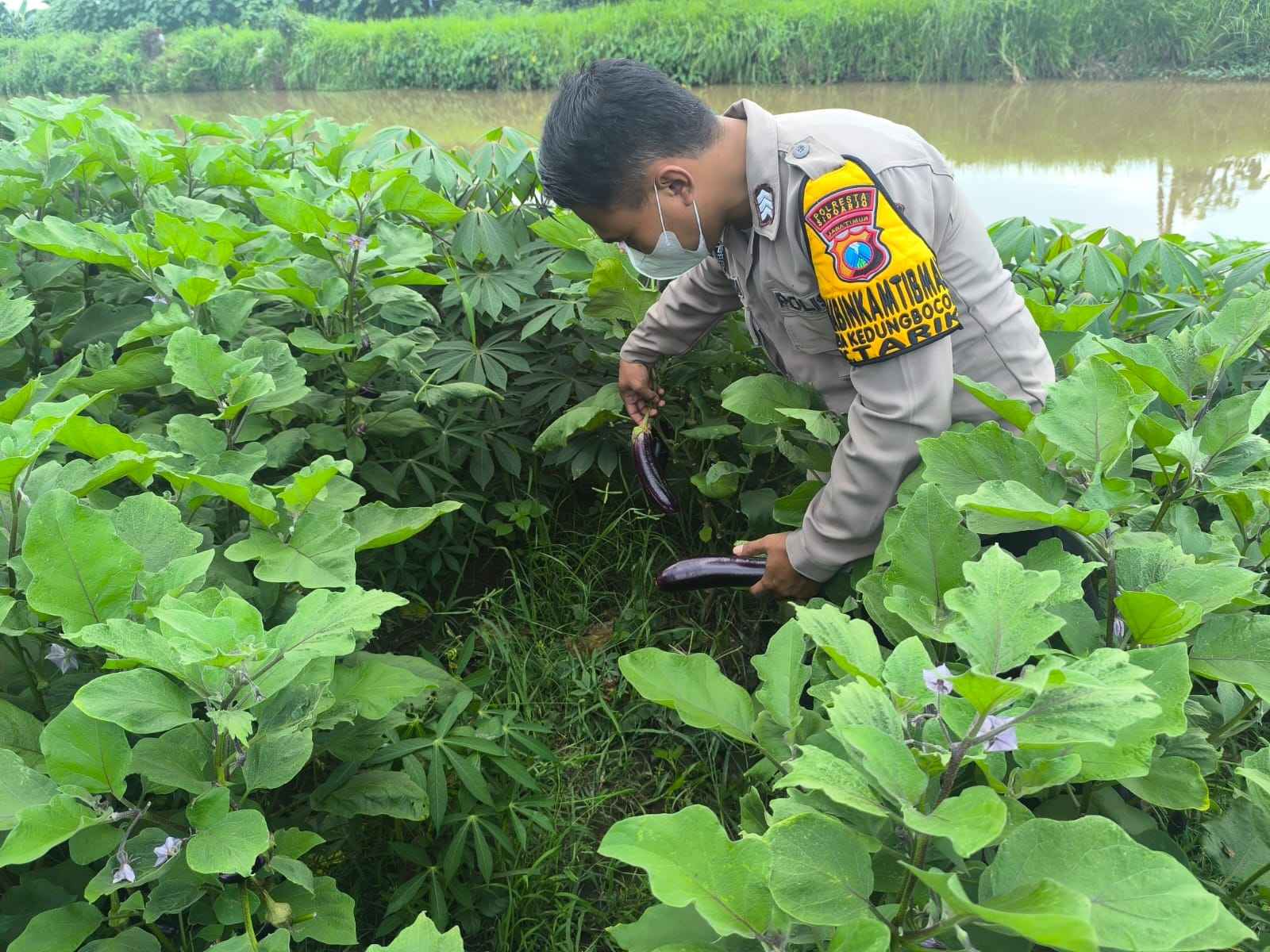 Bripka Ari Hendra Wardana menyampaikan pesan-pesan kamtibmas kepada petani serta mengajak untuk terus menjaga keamanan dan kerukunan di lingkungan sekitar. Ia juga menekankan pentingnya menjaga semangat dalam bertani, terutama komoditas seperti terong yang memiliki banyak manfaat.