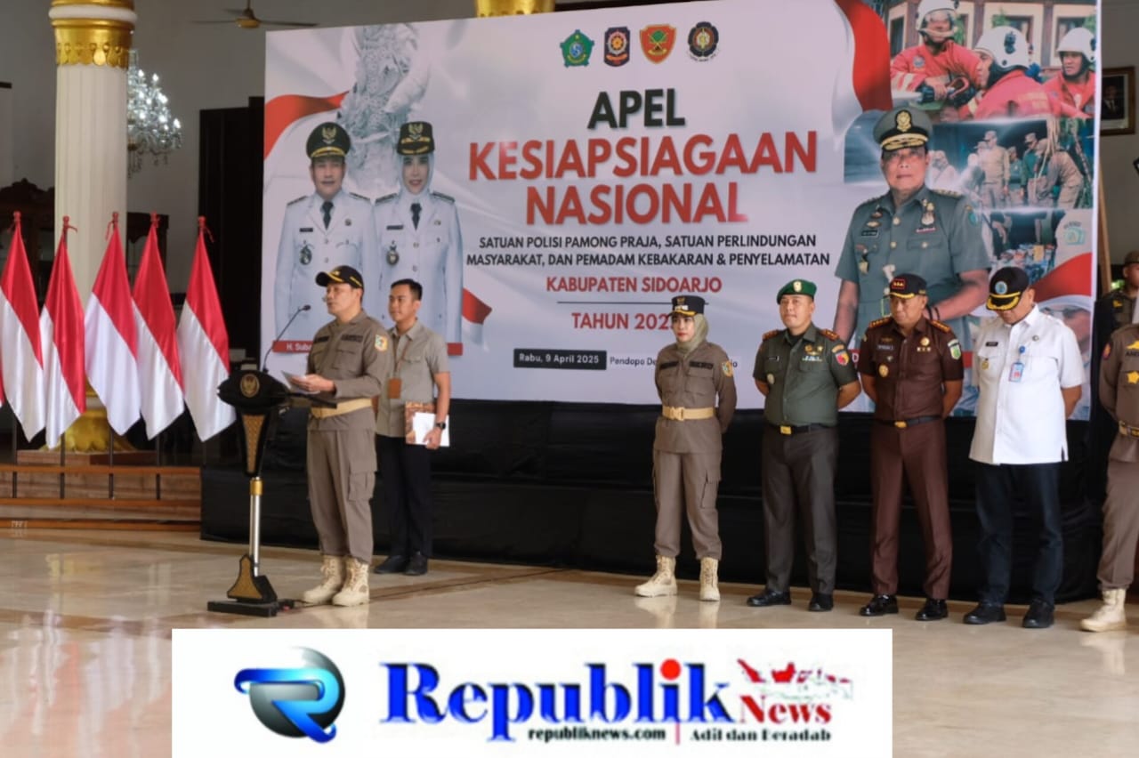 Republiknews.com,Sidoarjo – Dalam rangka memperingati Hari Ulang Tahun ke-75 Satuan Polisi Pamong Praja (Satpol PP), ke-63 Satuan Perlindungan Masyarakat (Satlinmas), dan ke-106 Pemadam Kebakaran (Damkar), Pemerintah Kabupaten Sidoarjo menggelar Apel Kesiapsiagaan Nasional Satpol PP, Satlinmas, dan Damkar di Pendopo Delta Wibawa pada Rabu,(8/4/25).