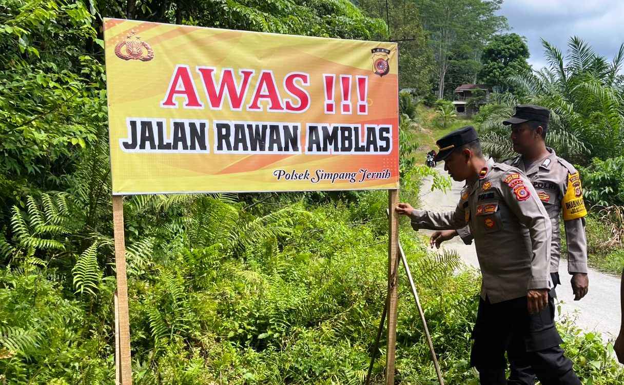 Aceh timur, Guna mencegah terjadinya hal-hal yang tak diinginkan seperti kecelakaan, Kapolsek Simpang Jernih, Polres Aceh Timur, Polda Aceh, Ipda Safwadinur, S.H.,M.H. beserta sejumlah anggotanya bergerak cepat melakukan pemasangan rambu-rambu peringatan di jalan yang rusak, rawan longsor serta jalan curam dan berbukit. Selasa, (08/07/2025) sore.