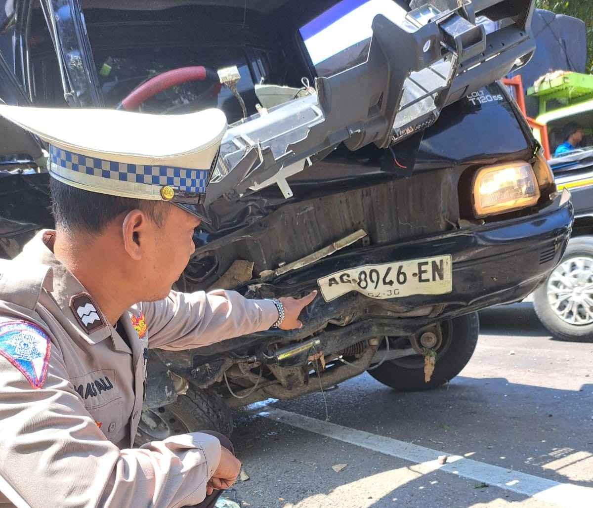 Dari arah yang berlawanan melaju mobil pickup AG 8946 EN yang dikemudikan Mohamad Alvian Puji Santoso 34 tahun warga Mojokerto