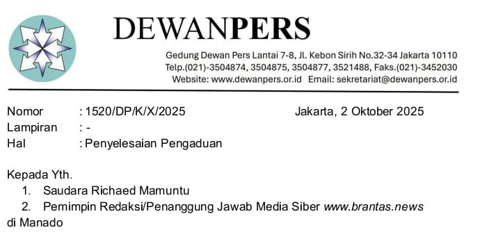 Dengan itu Dewan Pers memberikan keputusan kepada ” Media siber www.brantas.news, yang tertuang dalam surat Dewan Pers Nomor: 1520/DP/KIX/2025, tertanggal 2 Oktober 2025.
