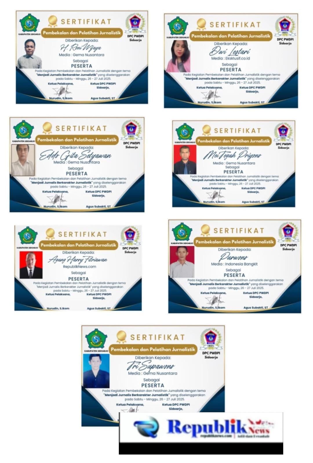 Republiknews.com,Sidoarjo, 29 Juli 2025 – Dewan Pimpinan Cabang Perkumpulan Wartawan Duta Pena Indonesia (DPC PWDPI) Kabupaten Sidoarjo sukses menggelar kegiatan Pembekalan dan Pelatihan Jurnalistik pada tanggal 26–27 Juli 2025, yang ditutup dengan penyerahan sertifikat peserta kepada para jurnalis dari berbagai media.