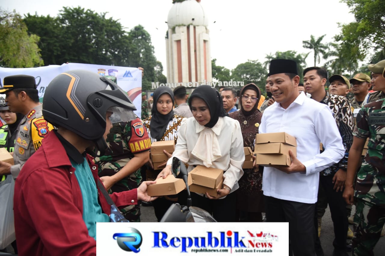 Republiknews.com,Sidoarjo. Bagi-bagi takjil buka puasa dilakukan Forkopimda Sidoarjo di depan Monumen Jayandaru Alun-alun Sidoarjo Kamis sore, (27/3). 4 ribu takjil dibagikan Bupati Sidoarjo H. Subandi bersama Wakil Bupati Sidoarjo Hj. Mimik Idayana, Kapolresta Sidoarjo Kombes. Pol. Christian Tobing dan Dandim 0816 Sidoarjo Dedyk Wahyu Widodo kepada pengendara yang melintas. Bahkan pengunjung Alun-alun Sidoarjo juga ikut antri untuk mendapatkan takjil tersebut.