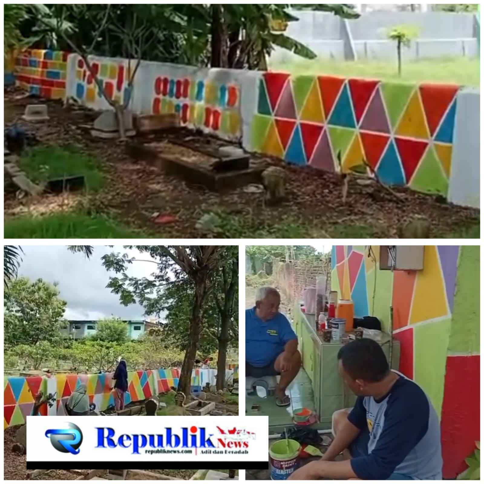 Di sini, Ketua Yayasan Baitussalam beserta pengurus Yayasan Baitussalam Pondok Sedati Asri bahu membahu mengecat dinding tembok makam dihias menggunakan cat warna-warni.