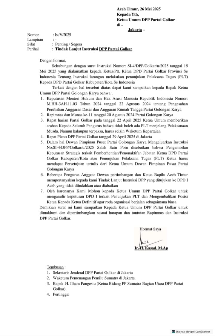 Aceh Timur– Dewan Pimpinan Pusat (DPP) Partai Golkar mengeluarkan intruksi jelang Musyawarah Daerah (Musda). Intruksi ini terkait larangan penunjukan pelaksana tugas (Plt) Ketua DPD Partai Golkar di tingkat kabupaten/kota.