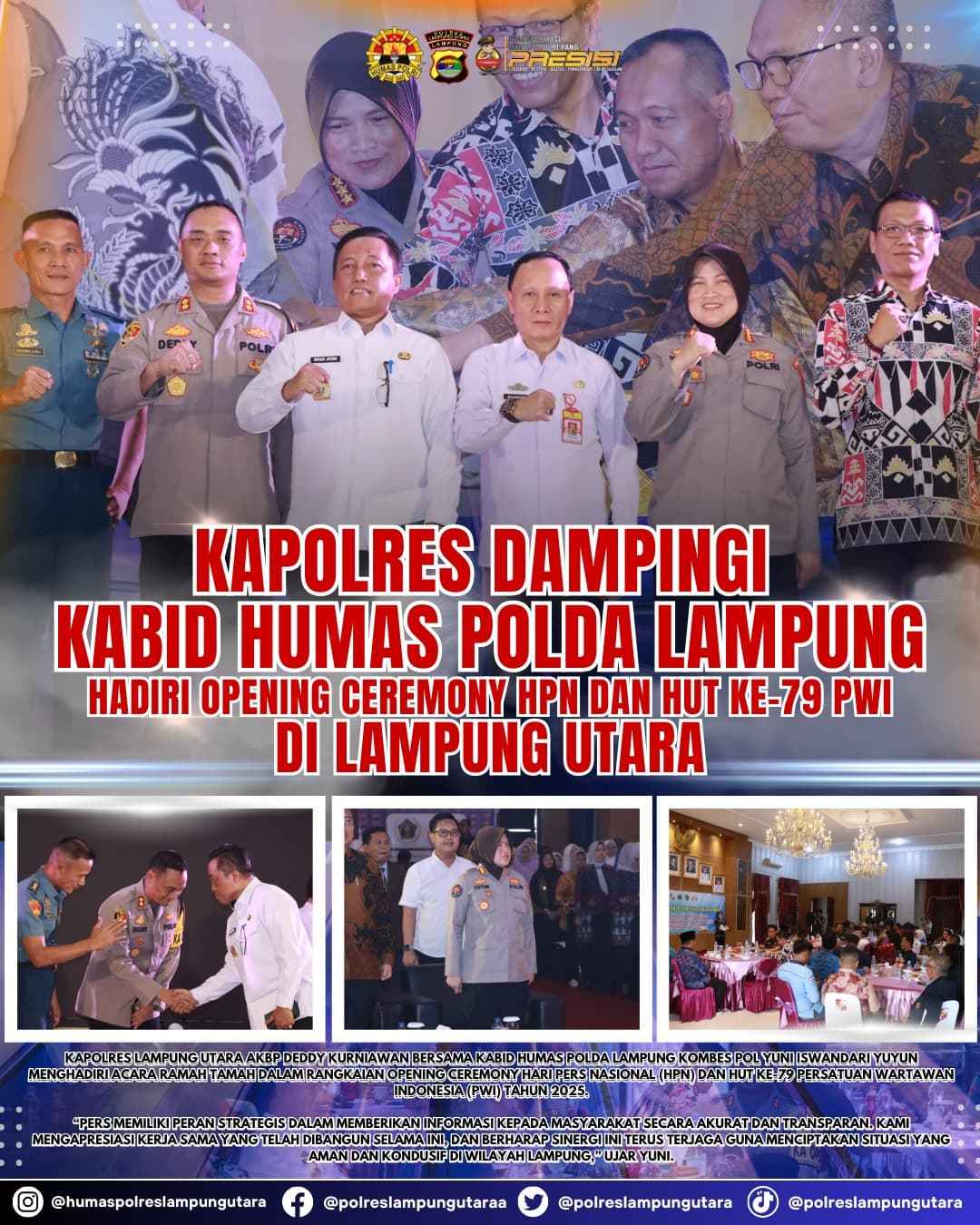 Lampung Utara – Republiknews.com, Kapolres Lampung Utara AKBP Deddy Kurniawan bersama Kabid Humas Polda Lampung Kombes Pol Yuni Iswandari Yuyun menghadiri acara Ramah Tamah dalam rangkaian Opening Ceremony Hari Pers Nasional (HPN) dan HUT Ke-79 Persatuan Wartawan Indonesia (PWI) Tahun 2025.