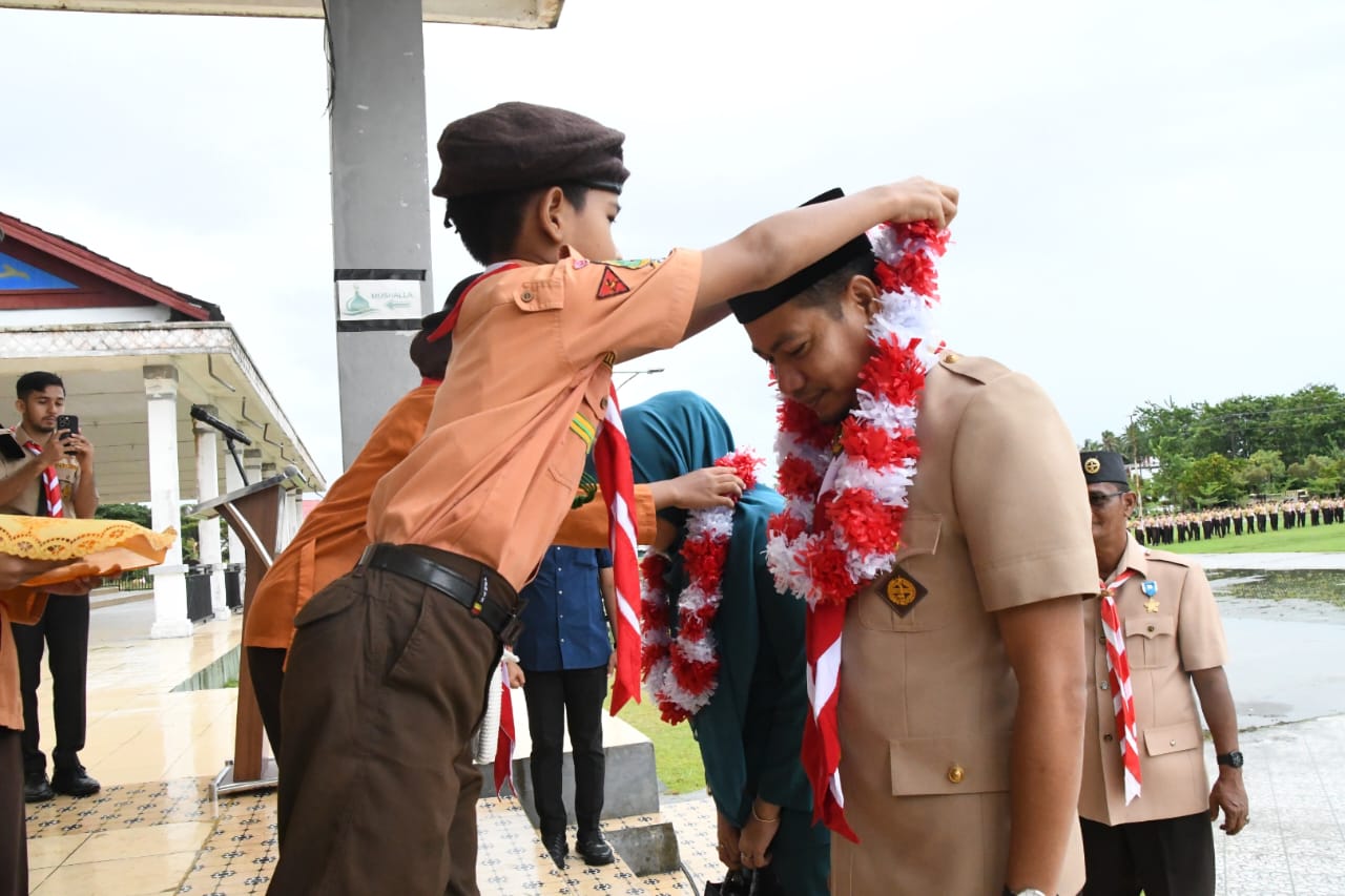 Aceh Timur- Langit Pusat Pemerintahan Aceh Timur tampak kelabu. Awan bergerak berat, seolah tak ingin menunda turunnya hujan. Namun Lapangan Upacara tetap ramai dipenuhi semangat ratusan pramuka dari berbagai penjuru Aceh Timur.