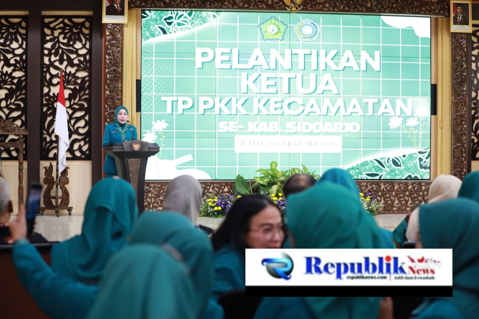 Republiknews.com,Sidoarjo – Ketua Tim Penggerak PKK Kabupaten Sidoarjo, Sriatun Subandi, secara resmi melantik 18 Ketua Tim Penggerak PKK Kecamatan se-Kabupaten Sidoarjo. Pelantikan tersebut digelar di Pendopo Delta Wibawa, Jumat (13/2/2026), sebagai upaya memperkuat peran PKK sebagai mitra strategis pemerintah daerah dalam pembangunan keluarga dan pemberdayaan masyarakat.
