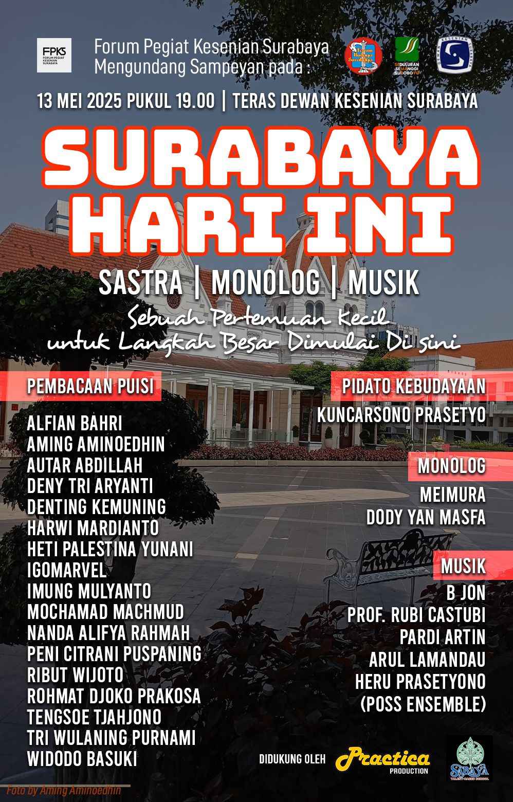 SURABAYA– Forum Pegiat Kesenian Surabaya (FPKS) dalam kegiatan perdananya yang berbasis seni pertunjukan, pada 13 Mei 2025, Pukul 19.00 menggelar “Surabaya Hari Ini” di Teras Dewan Kesenian Surabaya (DKS) yang berada di lingkungan Kompleks Balai Pemuda, Jl. Gubernur Suryo 15 Surabaya.