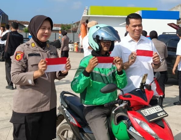 Direktorat Intelkam Polda Lampung membagikan bendera merah putih kepada pengendara yang melintas di sekitaran Jalan Terusan Ryacudu, Way Huwi, Kec. Jati Agung, Lampung Selatan sebagai bentuk Nasionalisme terhadap Negeri.