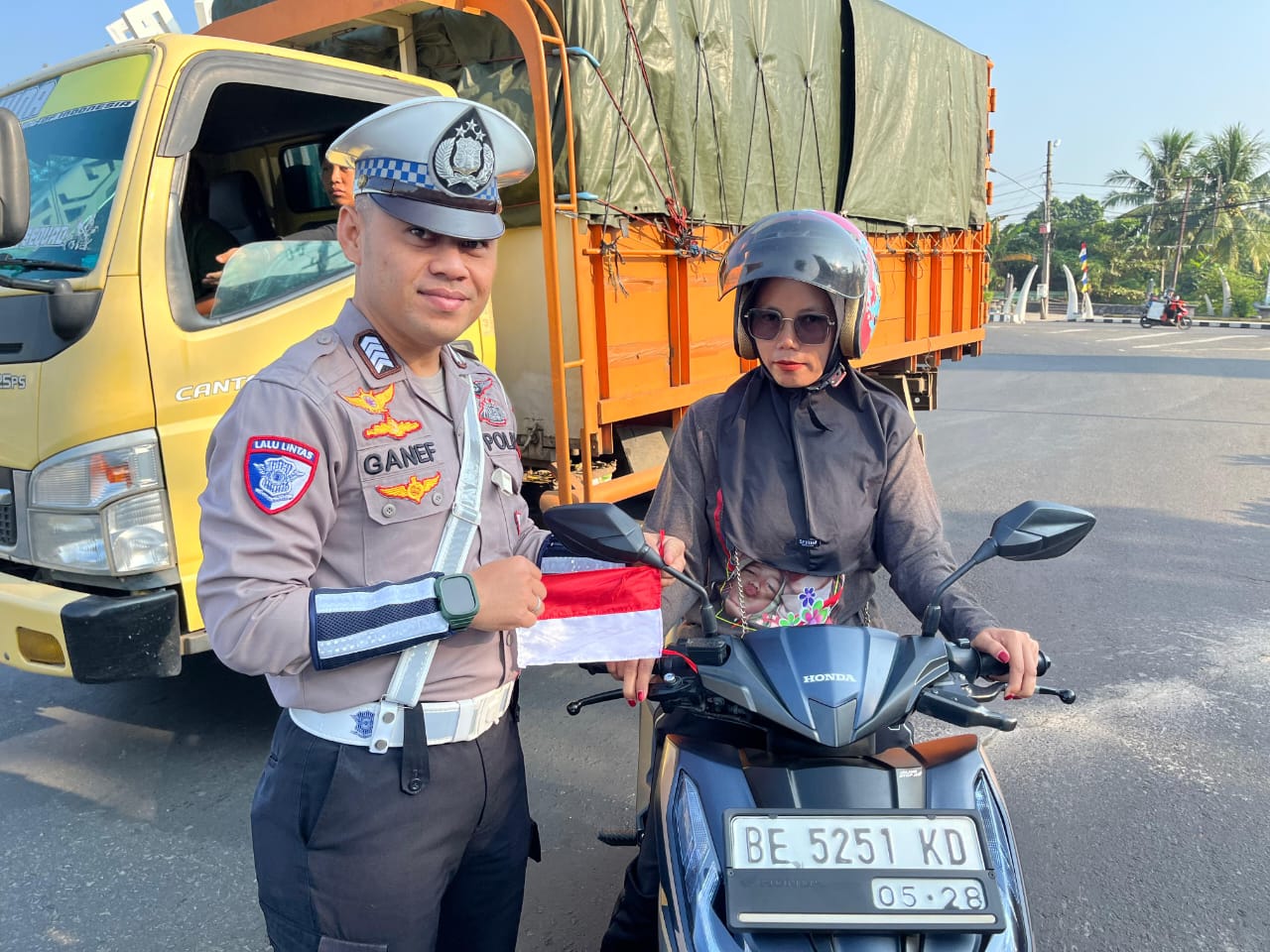 Satuan Lalu Lintas Polres Lampung Utara membagikan bendera merah putih kepada pengendara yang melintas di sekitaran Bundaran Tugu Payanmas sebagai bentuk Nasionalisme terhadap Negeri, Rabu (6/8/25).