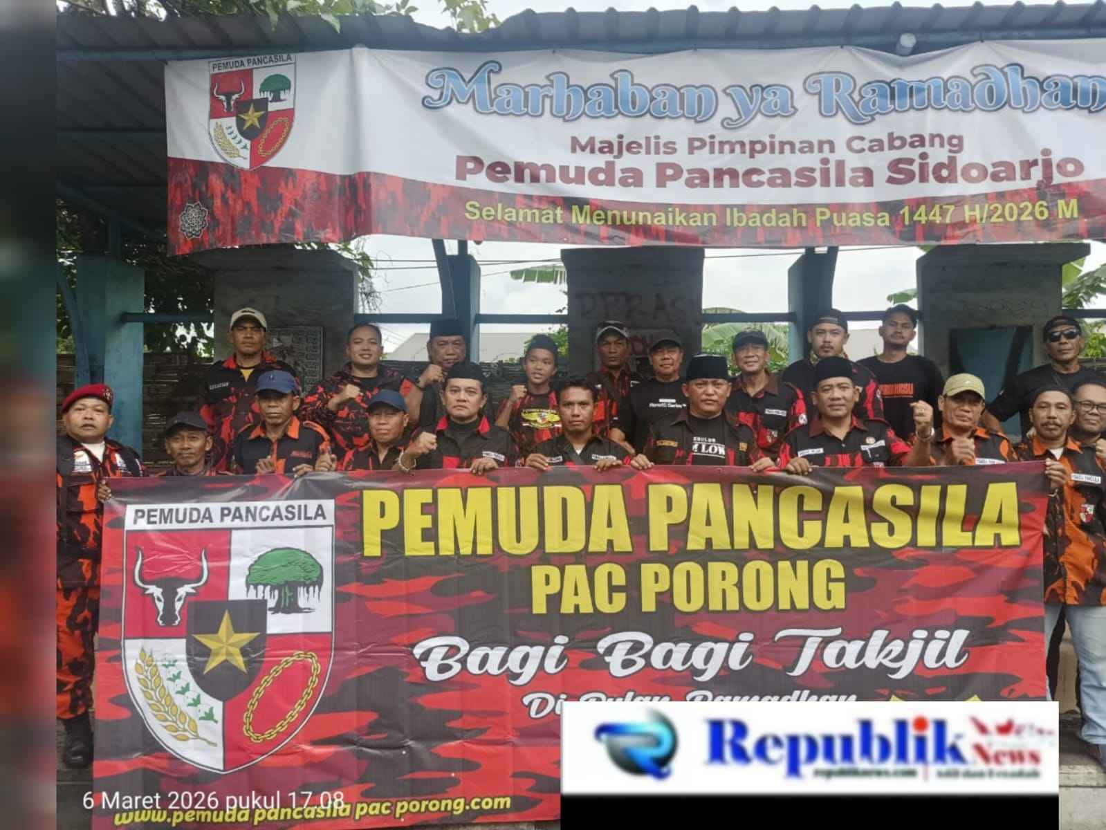 Republiknews.com,Sidoarjo – Dalam rangka menyemarakkan bulan suci Ramadan 1447 Hijriah/2026 Masehi, jajaran Pemuda Pancasila PAC Porong menggelar kegiatan sosial dengan membagikan takjil gratis kepada masyarakat dan pengguna jalan di Halte Bus Jenggolo, Jumat (6/3/2026) sore.