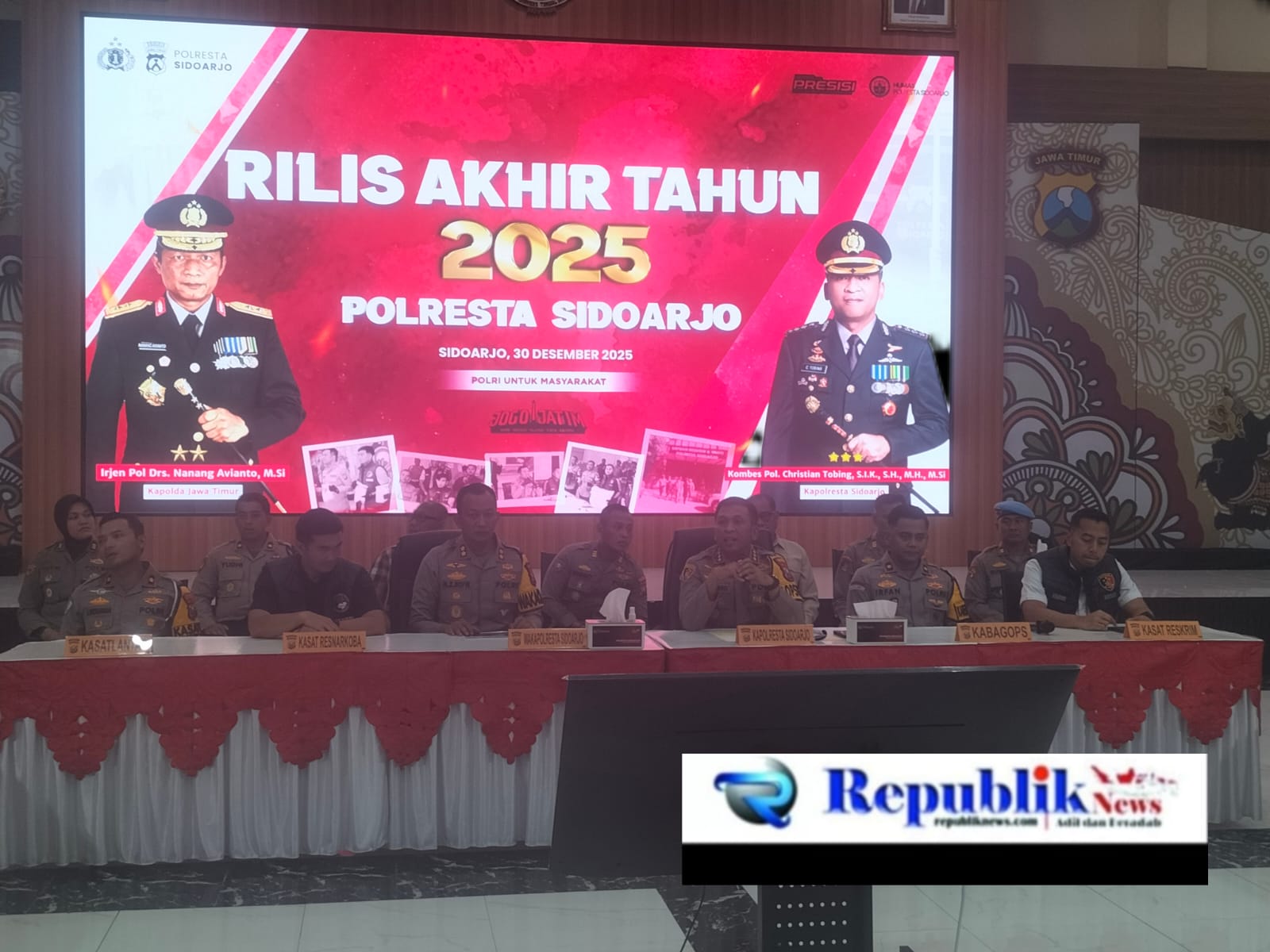 Republiknews.com, Sidoarjo – Polresta Sidoarjo menggelar Press Release Akhir Tahun 2025 pada Senin, 30 Desember 2025. Acara dipimpin oleh Kapolresta Sidoarjo Kombes Pol Christian Tobing, S.I.K., S.H., M.H., M.Si., serta turut dihadiri sejumlah Pejabat Utama Polresta Sidoarjo mulai dari Wakapolresta, Kasatreskrim, Kasatresnarkoba, Kabagops, Kasatlantas dan jajaran lainnya.