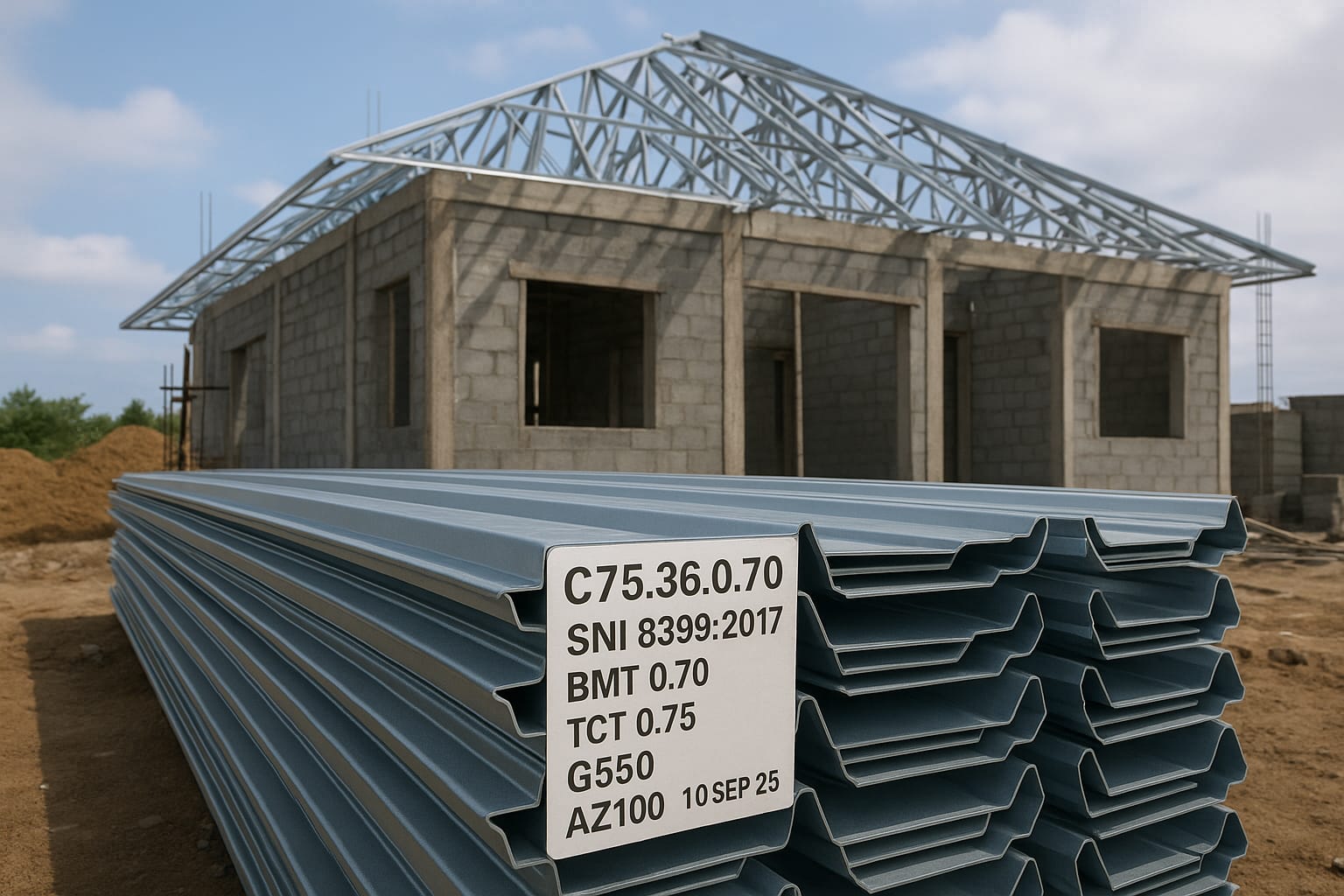 Misalnya produk dengan kode C75.36.0.70 – SNI 8399:2017 – BMT 0.70 – TCT 0.75 – G550 – AZ100 – 10 SEP 2