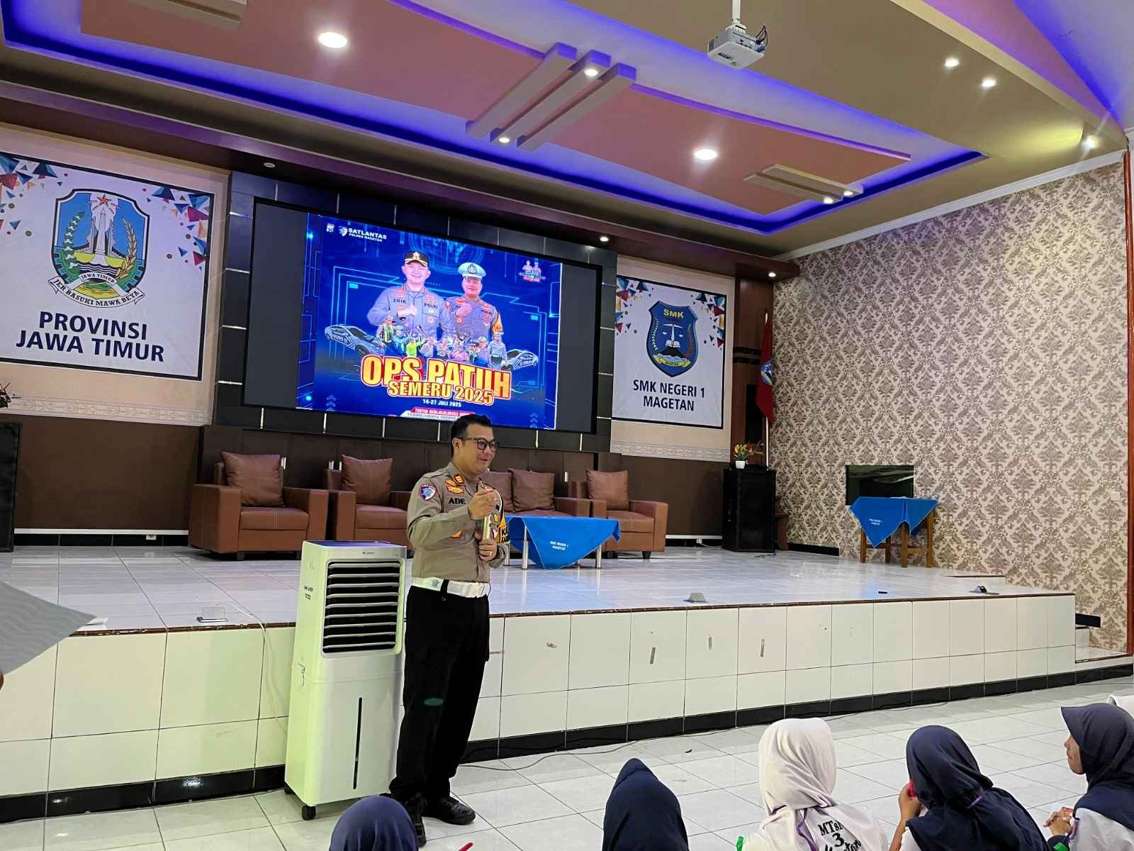 Kegiatan ini dilaksanakan di Aula SMKN 1 Magetan pada Selasa (22/7/2025), dipimpin langsung oleh Kasat Lantas Polres Magetan AKP Ade Andini, STK., S.I.K., M.H. bersama jajaran anggotanya.