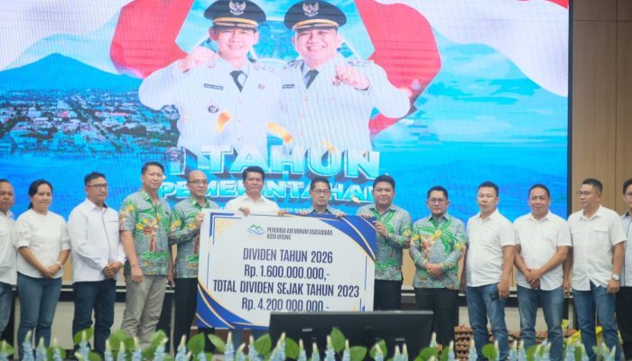 Peringatan itu dirangkai sederhana: doa syukur, buka puasa bersama, dan penyerahan dividen tahun buku 2026 dari Perumda Air Minum Duasudara sebesar Rp 1,6 miliar kepada Pemerintah Kota Bitung. Angka itu menjadi semacam penanda bahwa di tengah keterbatasan fiskal, ada badan usaha milik daerah yang masih mampu menyumbang pundi-pundi kas daerah.