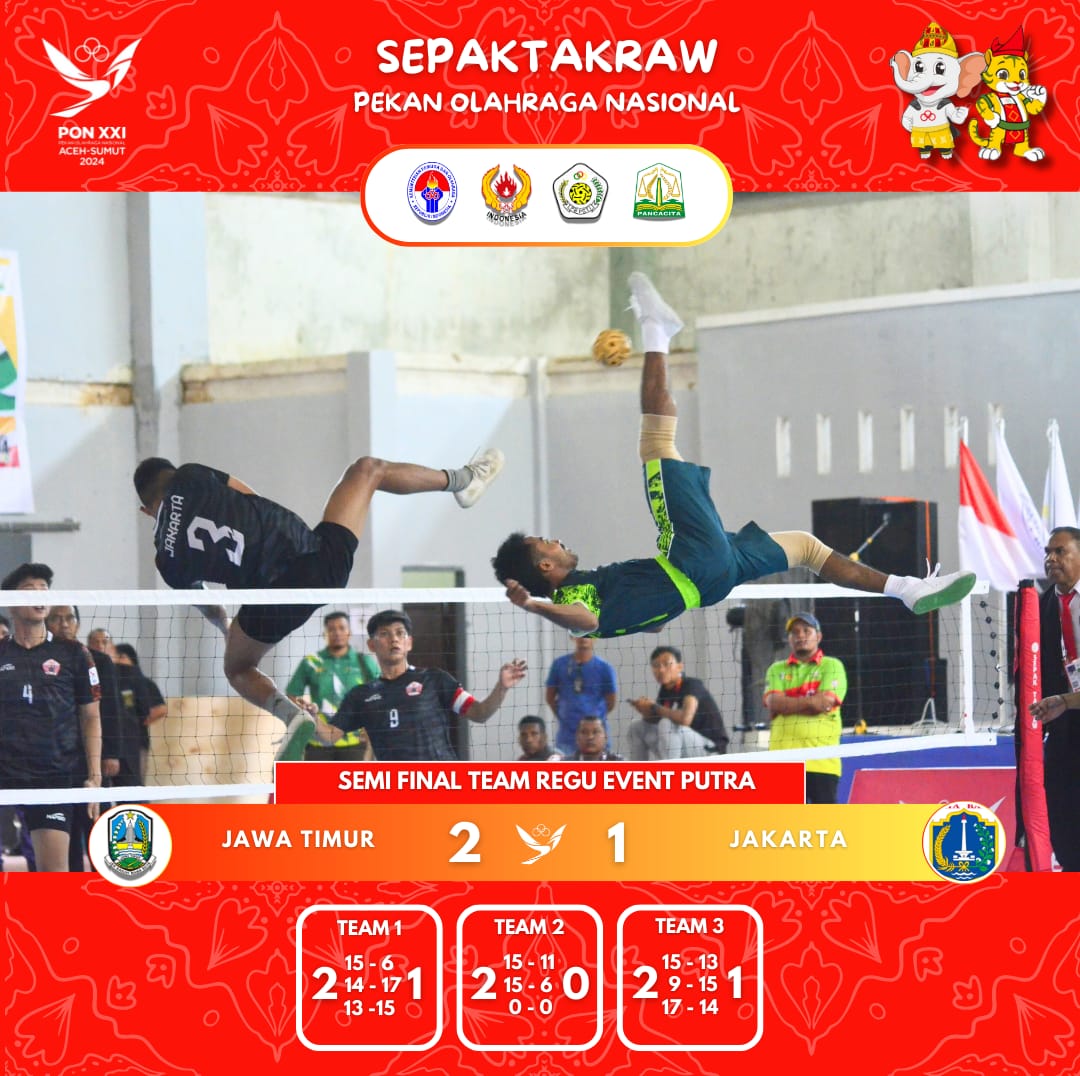 Republik News.com, Aceh Timur – Pertandingan semifinal kelas Tim Regu Event Putra Putri Sepak Takraw PON XXI Aceh- Sumut yang dipertandingkan Selasa (10/09/2024) di GOR Idi Sport Centre (ISC) Idi Rayeuk berakhir. Tim regu event putra-putri Jawa Timur dan Sulawesi Selatan maju ke babak final.