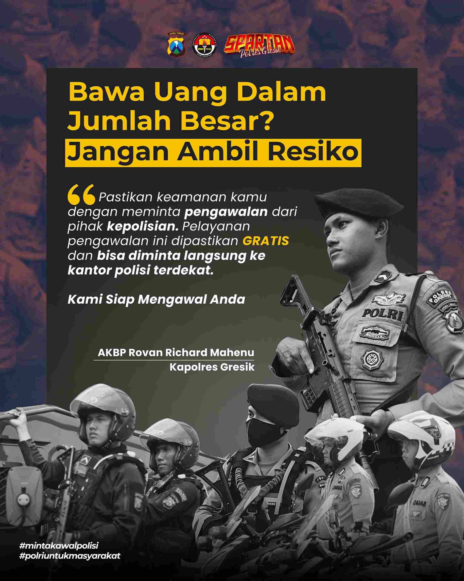 Polres Gresik mengingatkan bahwa masyarakat dapat memanfaatkan layanan pengawalan secara GRATIS, yang tersedia di seluruh kantor polisi terdekat. Layanan ini bisa diminta kapan saja, tanpa dipungut biaya, demi menjamin keamanan warga.